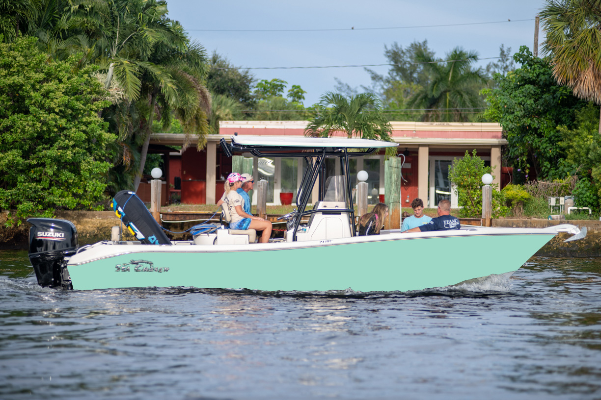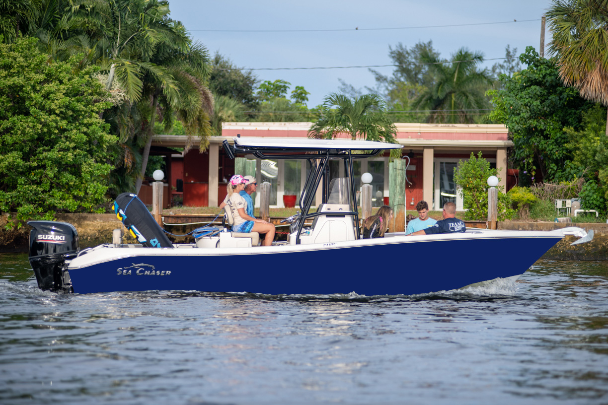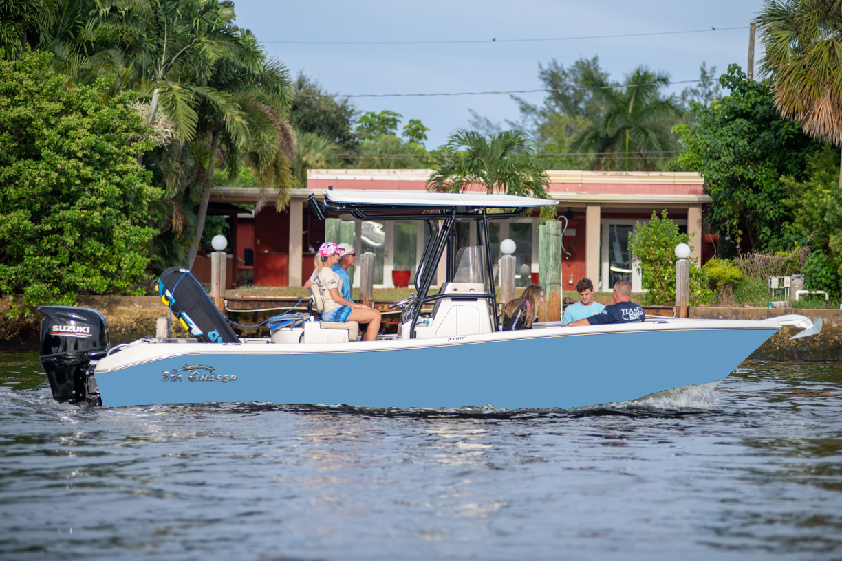 Whether you're heading offshore for fishing, exploring the coast or pulling a tube for family fun, the 2025 model year 24 HFC checks every box for on-the-water adventure. For boaters who love to raft up and swim, the 24 HFC comes standard with a portside entry door and a stern telescoping ladder for easy and safe access in and out of the water. Throughout the 24 HFC, find only the highest-quality stainless steel components, such as flush-mounted cup holders, rod holders and fold-down cleats. For fishing enthusiasts, keep more bait onboard inside the built-in 25-gallon stern baitwell, which easily doubles as dry storage when needed. Families and charter captains have plenty of room onboard the 24 HFC with the spacious U-shaped bow seating area, console front passenger seat and stern bench seat with a removable backrest. Contact your nearest Sea Chaser dealer today to see the 2025 model year 24 HFC!